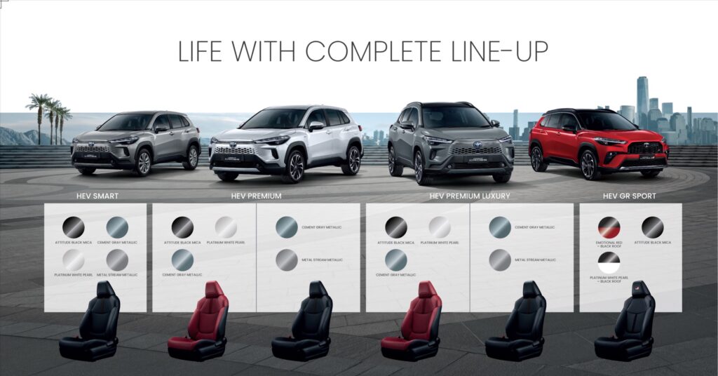 1. สำหรับภายในสีแดง Dark Rossa มีเฉพาะสีเทา Cement Gray Metallic, สีขาวมุก Platinum White Pearl และ สีดำ Attitude Black Mica ในรุ่น HEV Premium Luxury และ HEV Premium