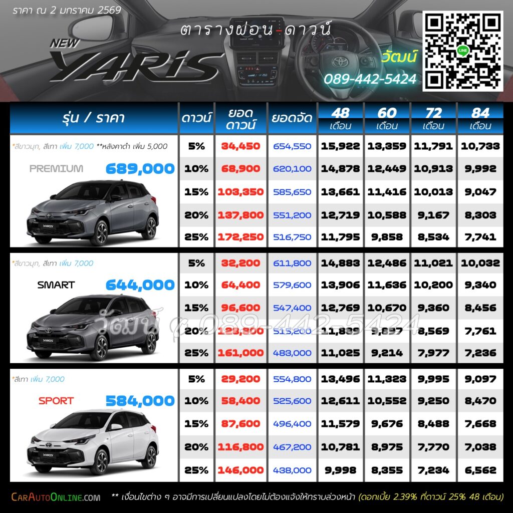 ตารางการผ่อนดาวน์ YARIS 2026 แต่ละรุ่น
